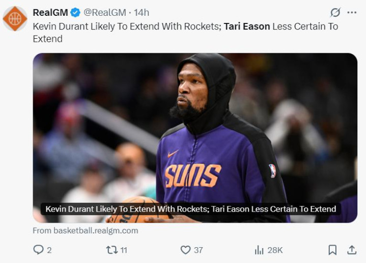 随后美媒RealGM也透露,凯文-杜兰特大概率会跟火箭达成提前续约,但伊森能否与火箭达成提前续约还不确定,杜兰特的续约优先级实际上已经高于伊森。