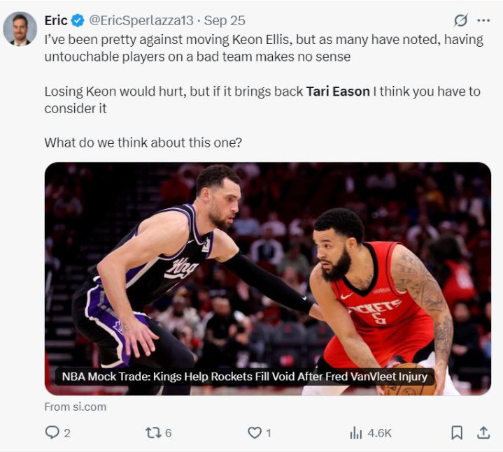 国王方面也在关注伊森的动向,过记者提出的是一份送出基恩-埃利斯+26年黄蜂二轮签+570万交易特例,得到伊森、230万交易特例的方案,埃利斯成为火箭队先发一号位。