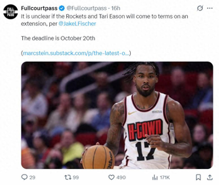 北京时间9月28日,根据BR记者杰克-费舍尔的报道,火箭队与塔里-伊森的提前续约陷入僵局,目前尚不得知火箭队是否会在今夏续约伊森,续约的截止日期是10月20日。