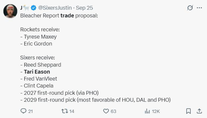 《露天看台》则建议费城与火箭交易,费城送出马克西、戈登从火箭方面换来谢泼德、伊森、范弗利特、卡佩拉、27年太阳首轮、29年火箭/独行侠/太阳顺位更高首轮。(12月15日进行)