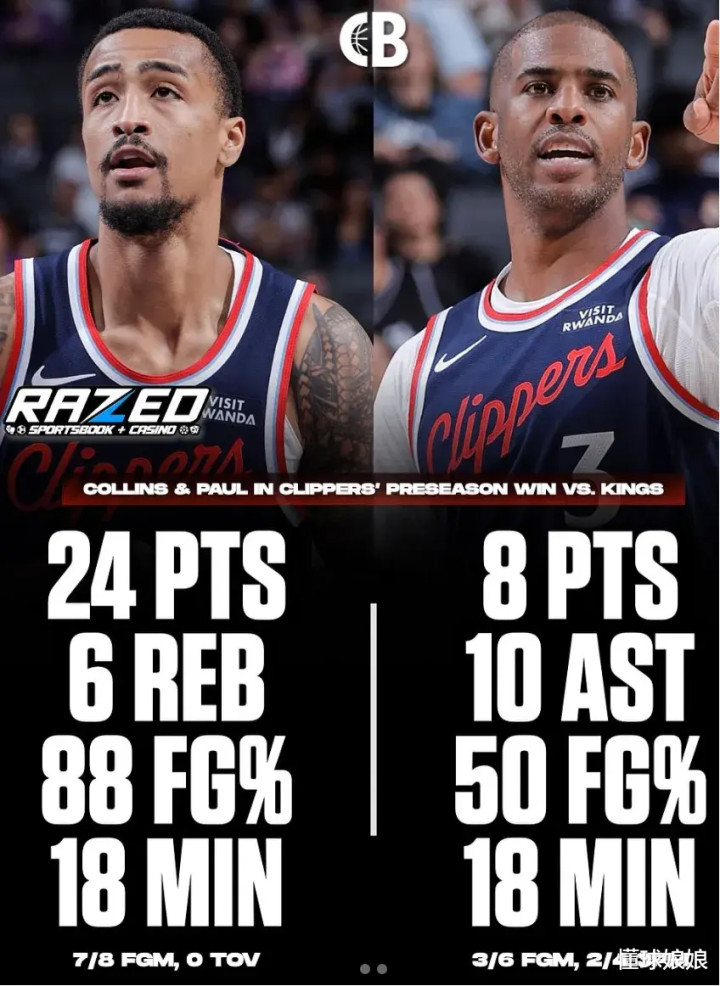 快船季前赛安排了4场,3胜1负。休赛季,快船引援动作可不小,就季前赛的验货效果来看,感觉是都不错的。洛佩斯打了3场,13.3分2.3板1.3助1.7帽重新回归的保罗,打了3场,场均8.3分5.3助3板用鲍威尔换回来的科林斯,打了4场,最后一场只打了9分钟,不算这一场的话, 科林斯3场场均是16分4.7板比尔只打了一场,拿到了12分2板
