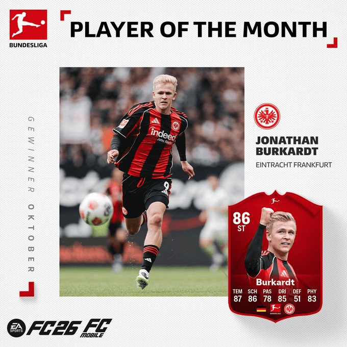 德甲官方: 法兰克福前锋伯卡特当选10月最佳球员