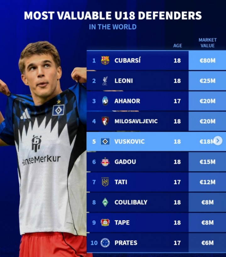 德转列U18后卫身价榜: 库巴西8000万断崖领跑, 莱奥尼2500万第二