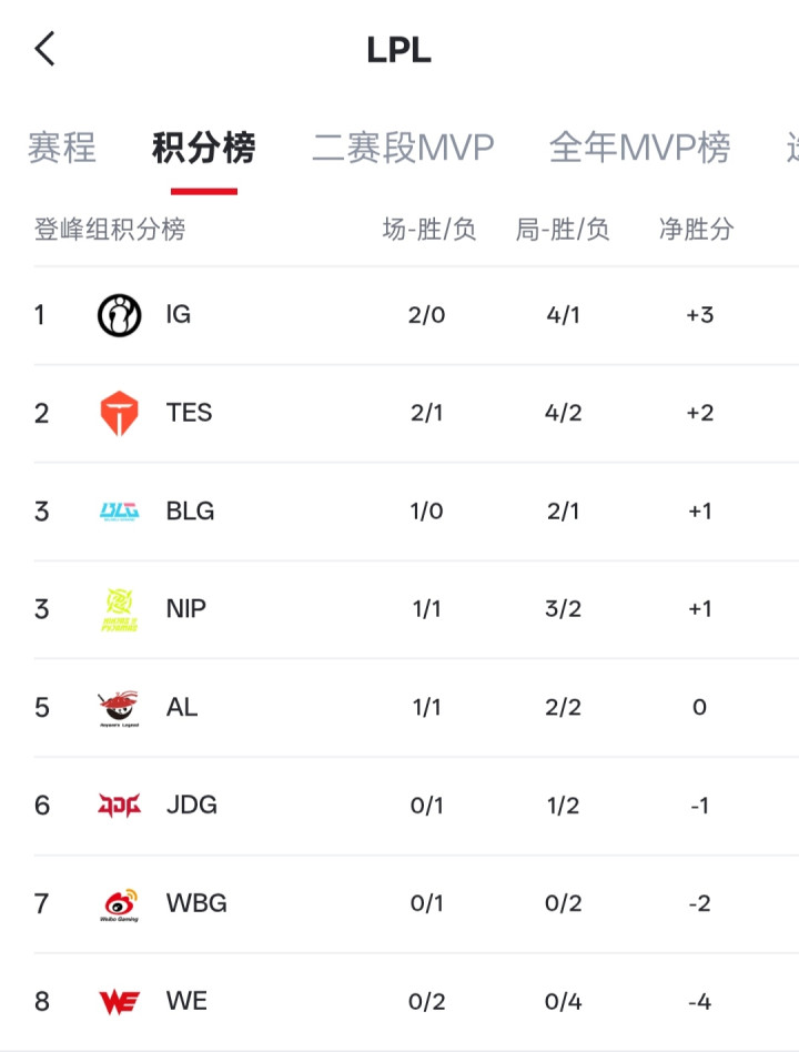 虎扑04月09日讯LPL昨日比赛结束,赛后最新LPL战队排名如下图: