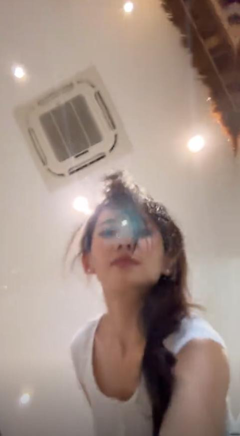 她先拿着手机对准自己展示了一下美貌和穿搭。